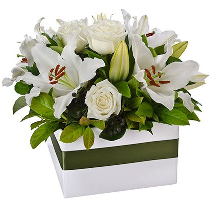 This elegant arrangement of beautiful blooms in a white box will help to express your thoughts and feelings at the time of a loss.